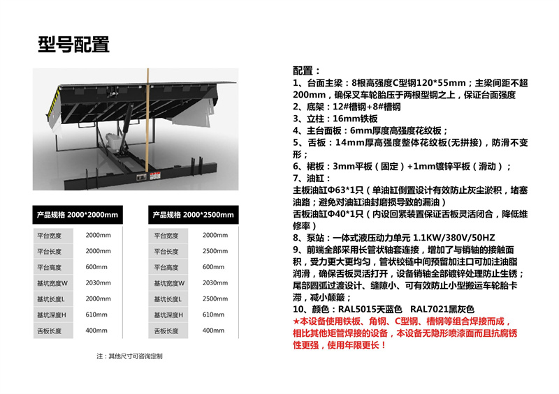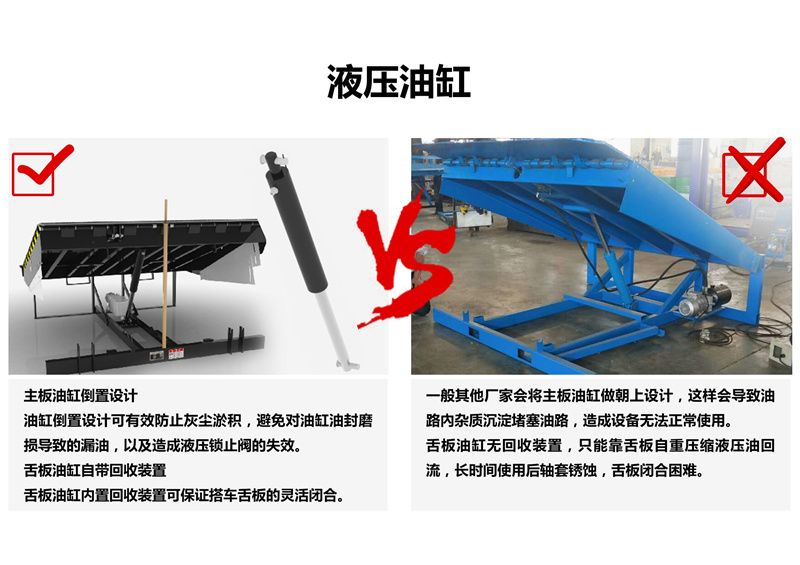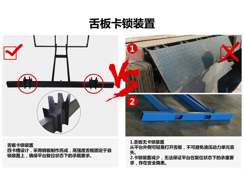通過動力系統,大油缸升起整個斜板,至頂位時,小油缸開始工作,順暢伸出活頁搭板, 高度調節板全部采用濟南濟鋼優質高度花紋鋼板及型材緊密焊接,壽命長久。