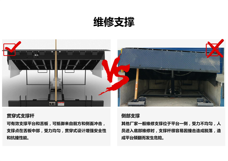 調節板兩側分別有3塊活動板,可有效避免調節板下降時壓傷腳趾的危險,以確保安全。固定式登車橋調節板底座前面為開放式設計,清理雜物方便快捷。